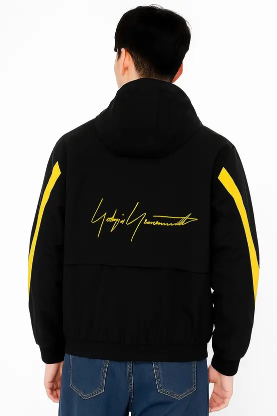 Step up your streetwear game with this sleek black hooded jacket, designed for both comfort and style. Featuring striking yellow stripes along the sleeves and a distinctive signature-inspired print on the back, this jacket effortlessly stands out in any crowd. The modern, relaxed fit ensures versatility for casual outings, daily wear, or layering during cooler days. Crafted from premium materials for durability and all-day comfort, this statement piece is available in a range of sizes for the perfect fit. Available exclusively in classic black with eye-catching yellow accents, it’s a must-have for any fashion-forward wardrobe. Pair it with your favorite jeans or joggers for an instantly elevated look.