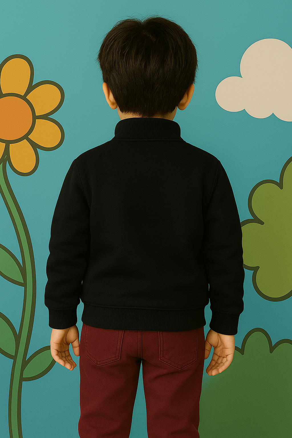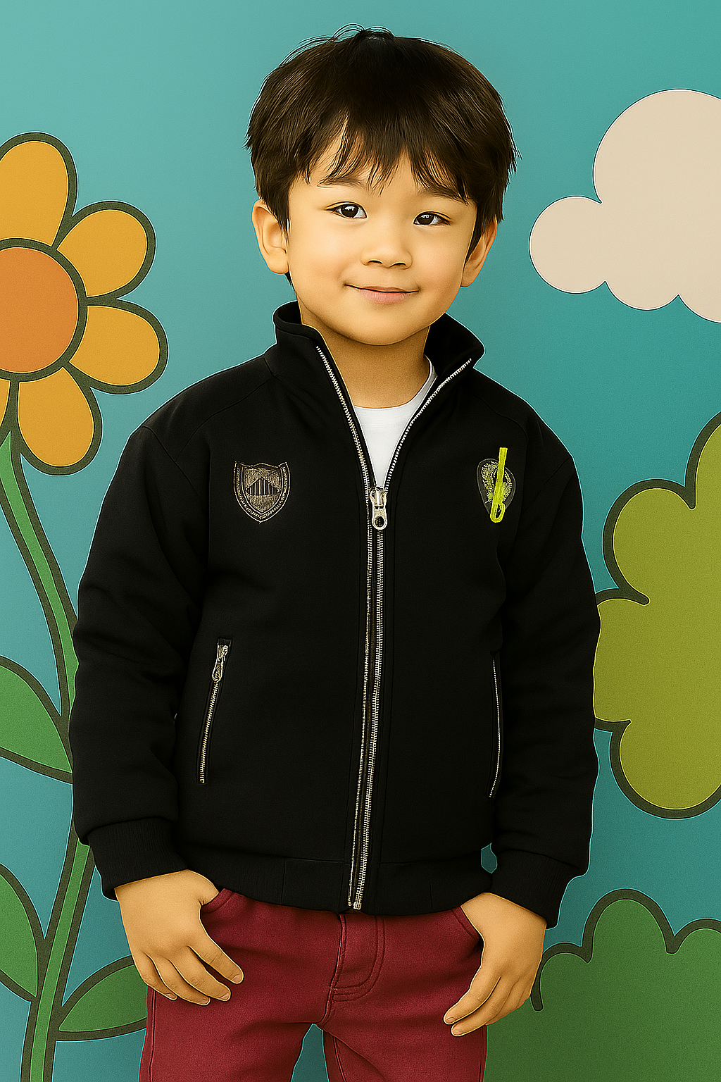 A young child stands smiling against a colorful, playful backdrop with illustrated flowers and clouds. The child is wearing a maroon zip-up jacket with small embroidered details and matching pants, giving a coordinated and cozy look. With neatly styled dark hair and a gentle, cheerful expression, the overall scene feels bright, warm, and child-friendly—perfect for a portrait, kids’ fashion catalog, or school-themed setting.