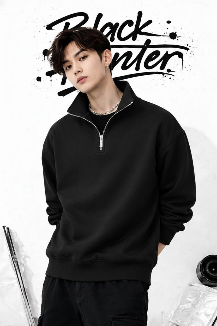 This is a sweatshirt featuring a high neck and a half-zip closure. The fabric has a textured appearance, suggesting comfort and warmth. The fit appears relaxed, making it suitable for everyday casual wear. Compatible products include jeans, casual trousers, sneakers, and t-shirts for layering underneath.